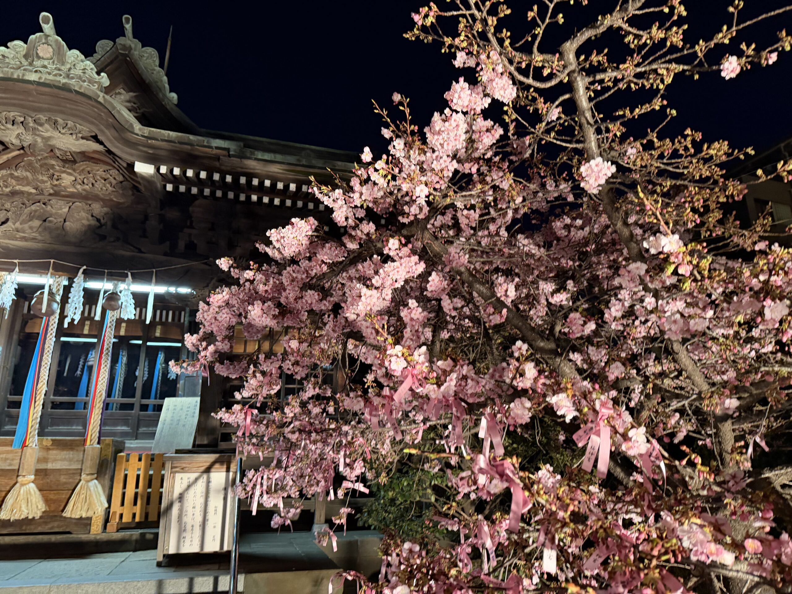 よく参拝に行きますが、夜に立ち寄ったら桜が咲いてました(河津桜)